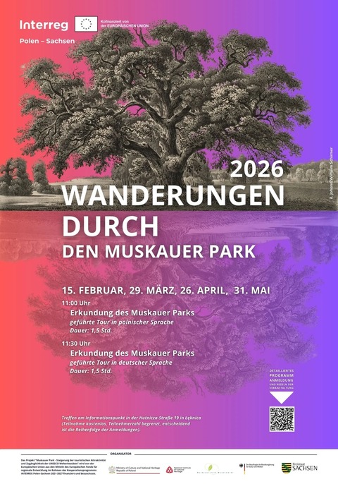 Wiosną zapraszamy na „Wędrówki po Parku Mużackim” – cykl edukacyjnych spacerów w języku polskim i niemieckim. Zapraszamy do poznania historii, architektury i przyrody parku podczas spokojnego spaceru w malowniczej scenerii.